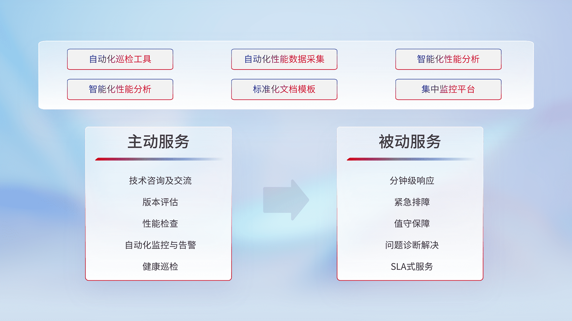 智能化工具和标准化文档,,,保障服务质量,,,提供主动服务(包含技术咨询、、、版本评估、、、性能检查、、、自动化监控与告警、、健康巡检)和被动服务包含(分钟级响应、、紧急排障、、值守保障、、、、问题诊断解决、、SLA服务)。。。